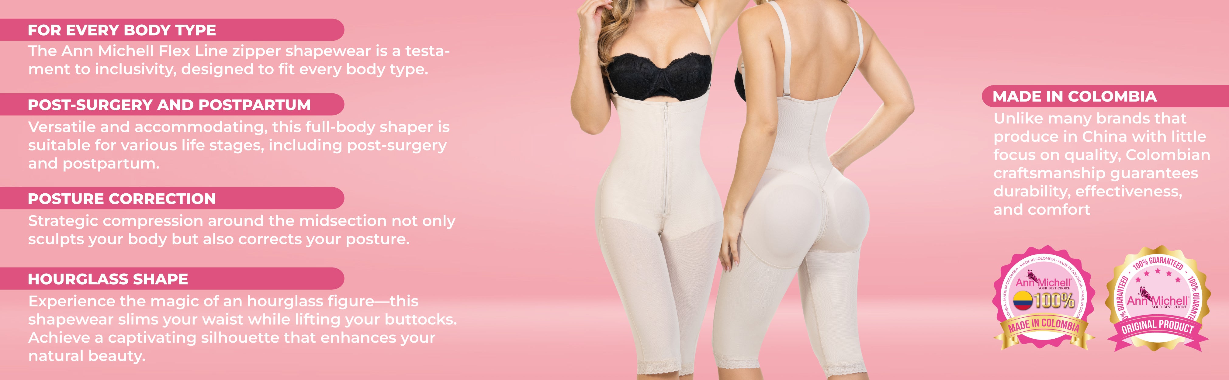 • About the garment: The Natashka knee-length body shaper is designed for post-surgery and post-partum, which is meant to control your abdomen, waist and hips. This bodysuit can reduce inches of your waist, while shaping your body into a slimmer silhouette. This full body shaper is designed with an open bust, an unnoticeable zipper for more compression, a straight back style with adjustable and removable straps, and an inner butt lifter. This garment features an anti-silicone leg lace to prevent it from rolling up.