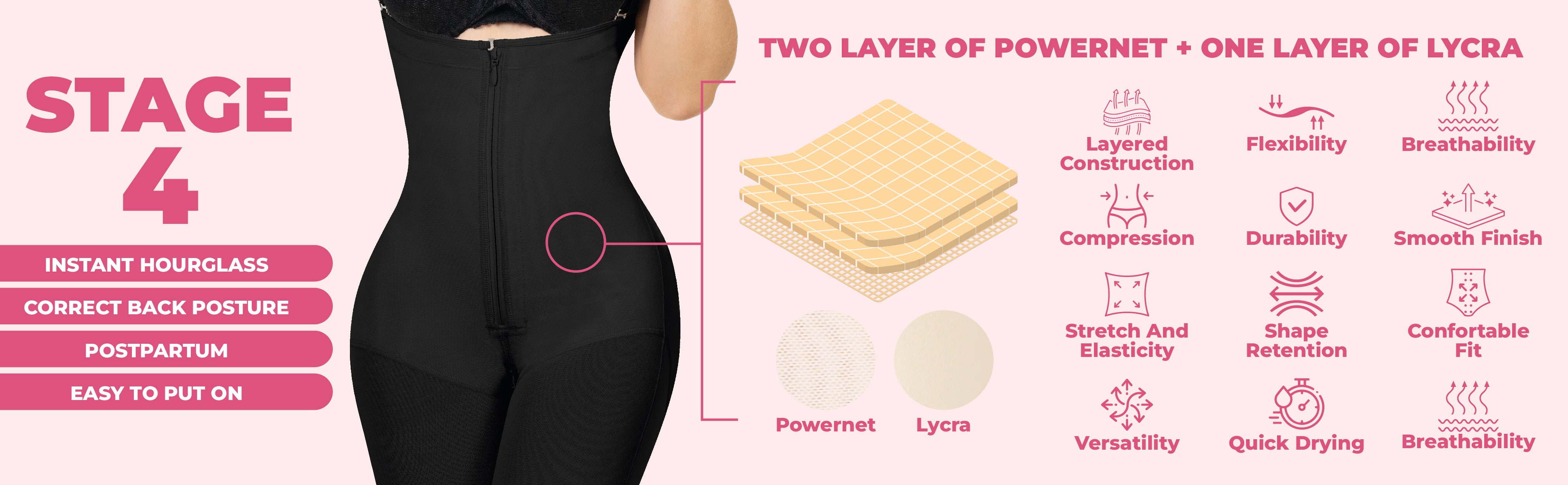 • Cold-Firming garments: This garment is perfect for post-surgery or post-partum. We use Powernet fabrics, which helps you get back to your preferred shape after surgery. This garment is perfect to wear after a liposuction or pregnancy to provide you with a medium compression to effectively shape and smoothen your abdomen and waist.
