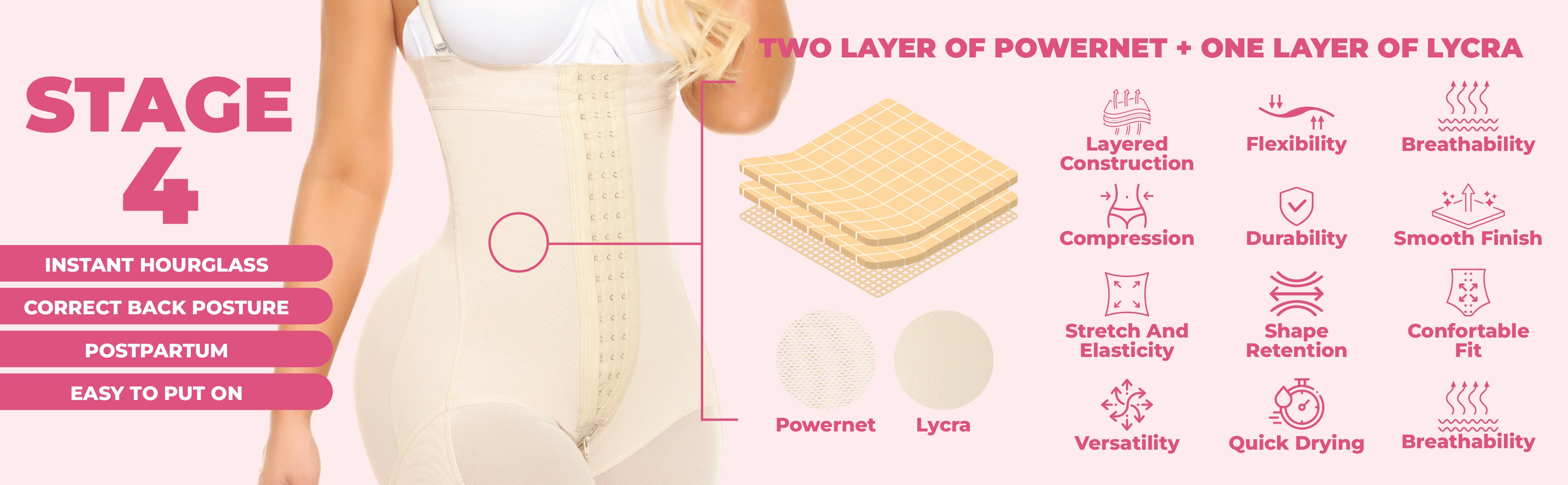 Our Stage 4 faja is engineered to shape your waist, enhance your hips, and support your glutes — all while offering exceptional abdominal and back control. With 3 rows of hooks, this strapless design delivers adjustable compression, removable straps for versatile wear, and a knee-length fit ideal for recovery or styling.