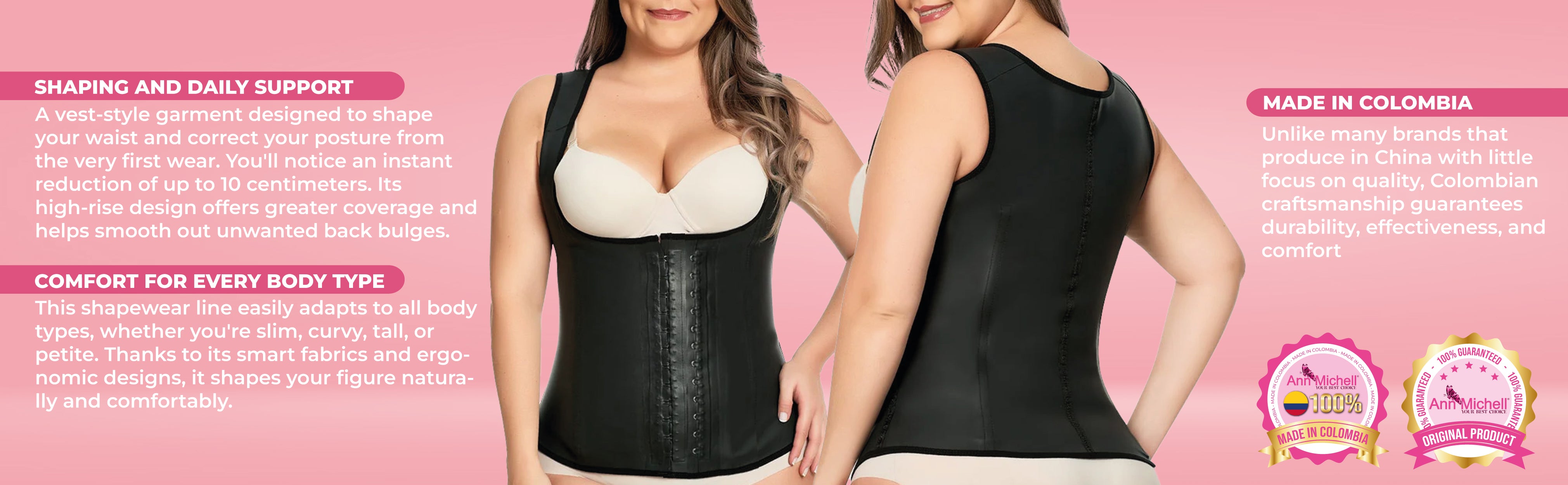 About this garment: Ann Michell’s latex vest trainer comes with thick straps that provide maximum support for your back and bust. It comes with three hooks and eye closure, that can allow you to increase compression. The vest features the best compression technology that will reduce inches from your abdomen as well as you back. This design also has an open bust, which allows you to wear your own bra.