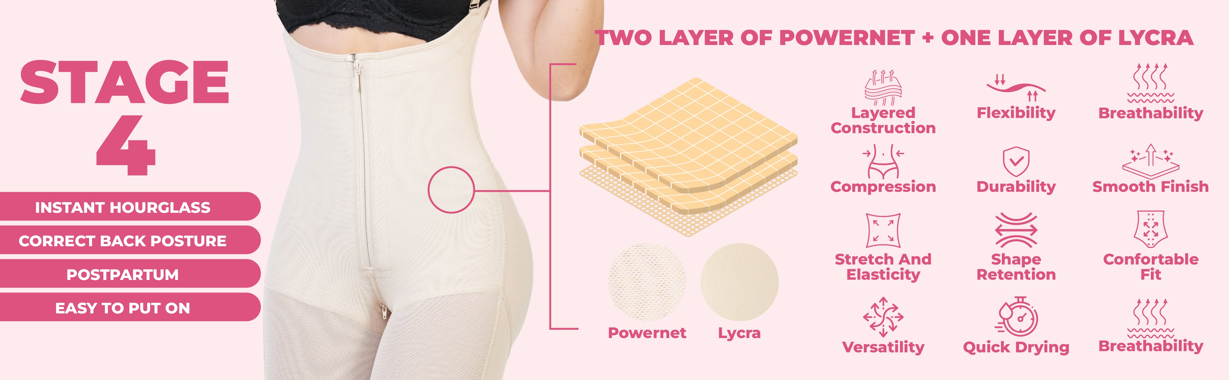 • Cold-Firming garments: This garment is perfect for post-surgery or post-partum. We use Powernet fabrics, which helps you get back to your preferred shape after surgery. The inner lining is made with lycra to allow movement with comfort. This garment is perfect to wear after a liposuction or pregnancy to provide you with a medium compression to effectively shape and smoothen your abdomen and waist.
