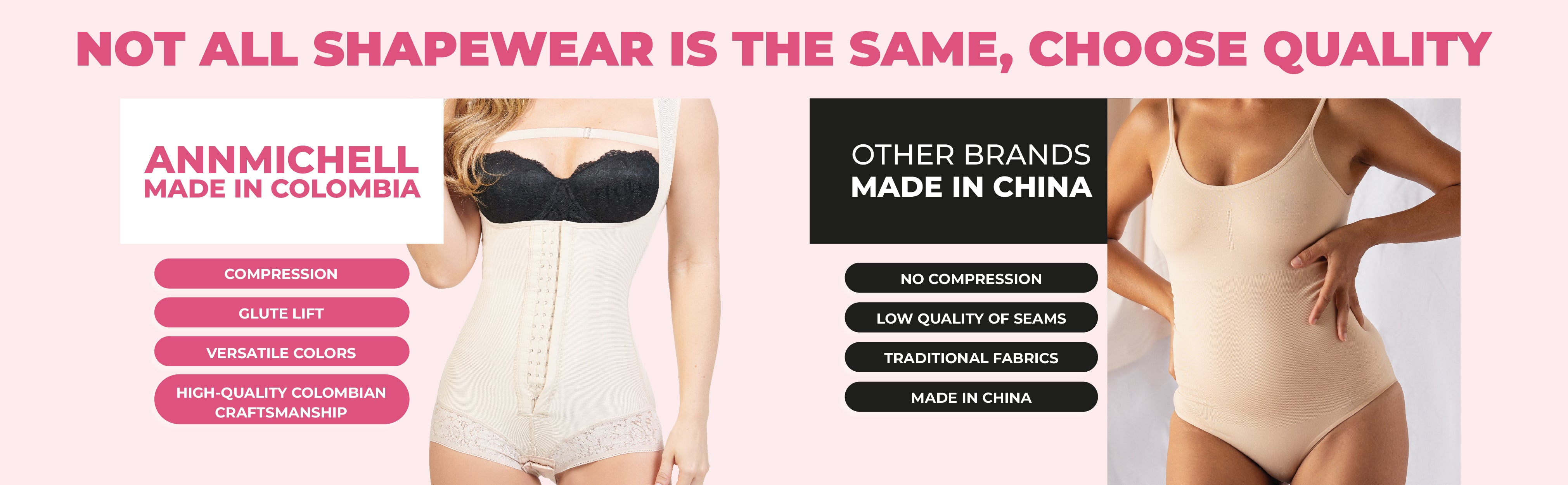 Discover the unmatched quality of ANTONELLA Colombian shapewear, proudly made in Colombia. Our products are crafted with precision and durability, offering far better results than cheap Chinese fajas that lose compression, tear easily, and simply don’t last.